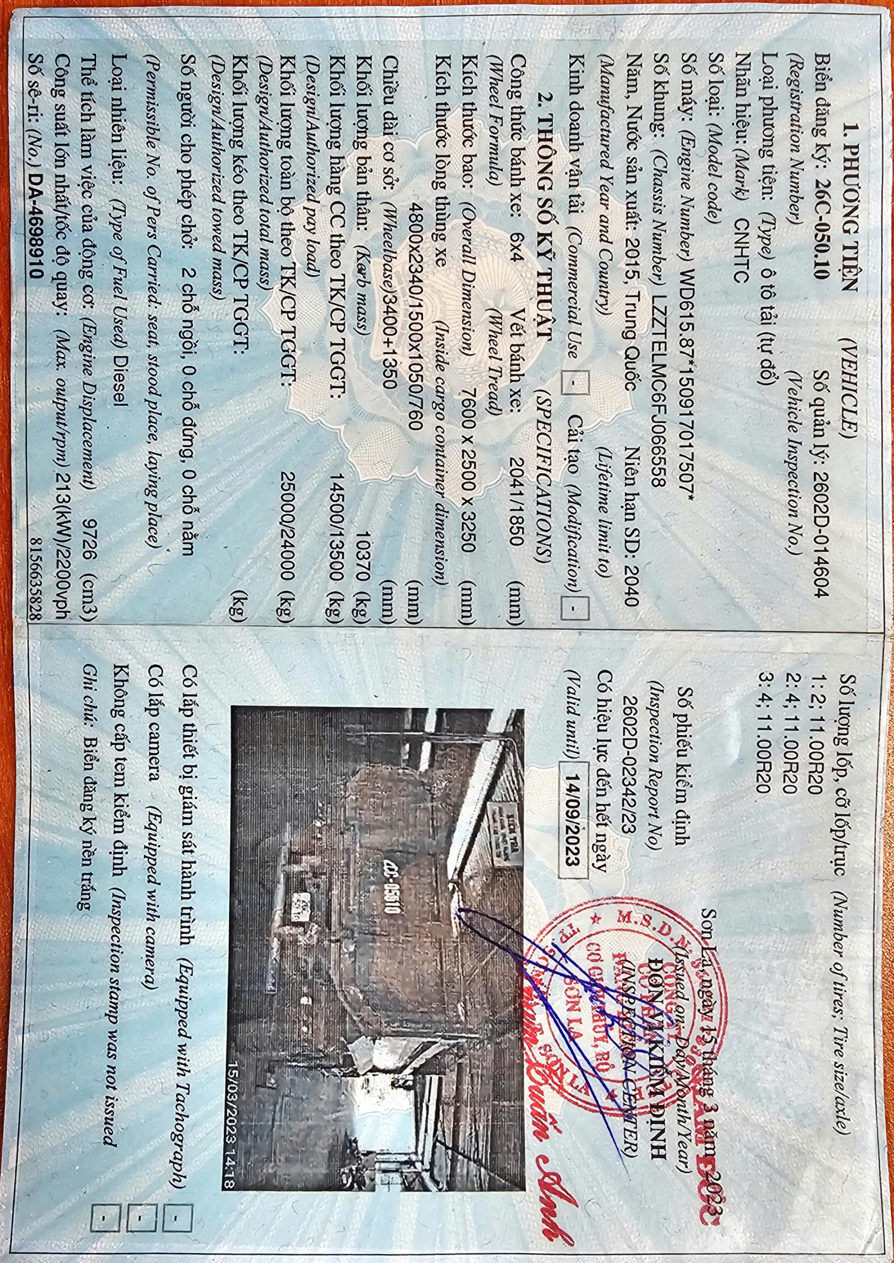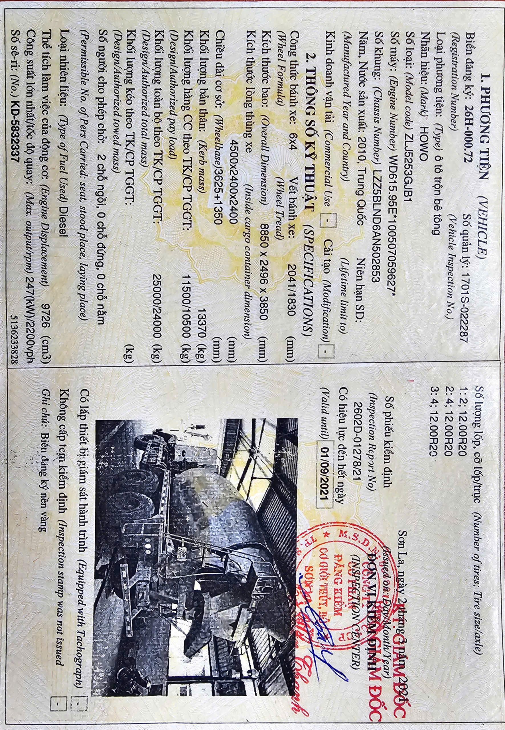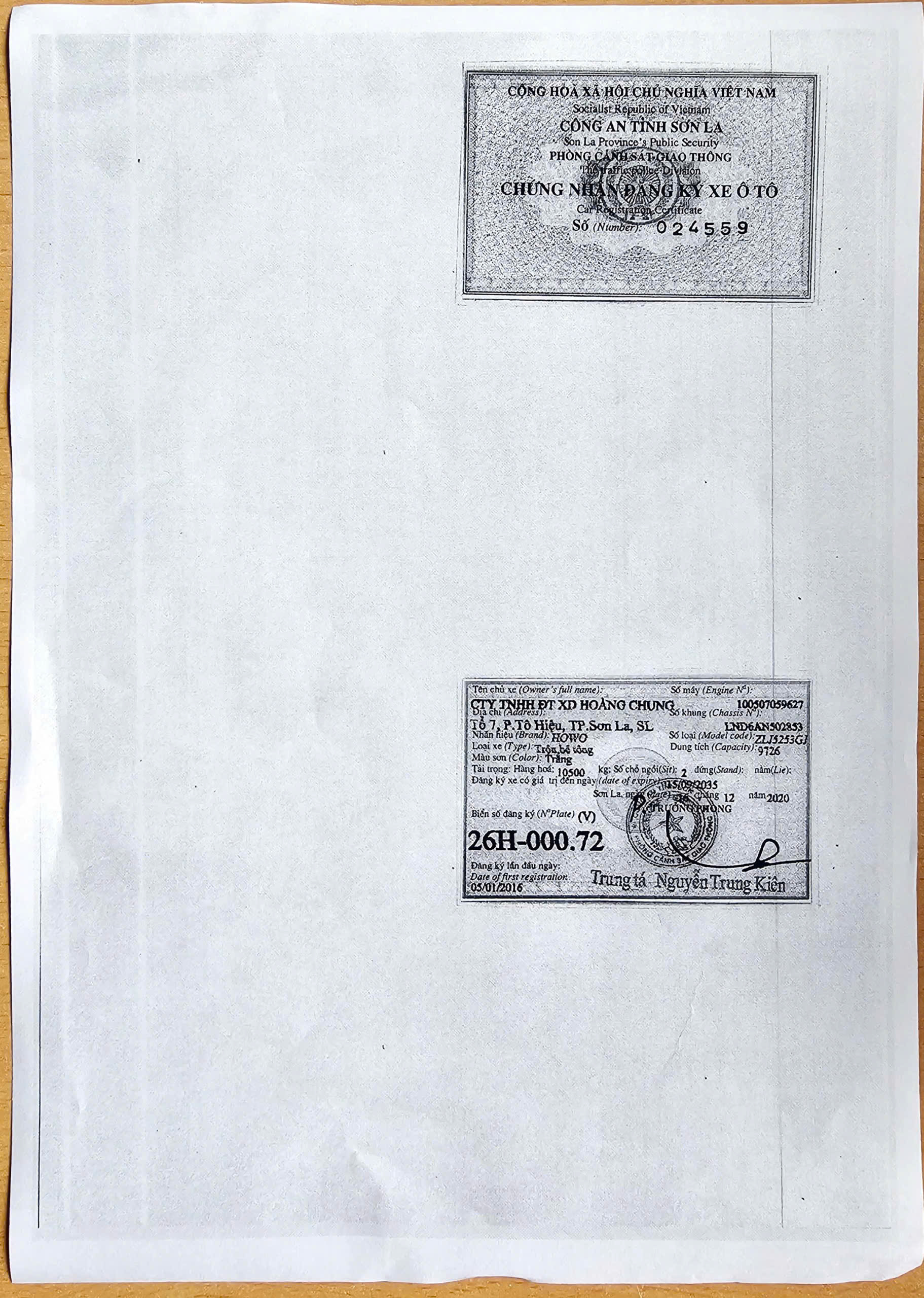 – Giấy tờ về tài sản: GCN ĐK xe ô tô số 022015 do CA tỉnh Sơn La cấp ngày 27/05/2020. – Nhãn hiệu: HOWO. – Màu sơn: Trắng. – Số máy: 110117106287. – Số khung: LND2BN585375. – Sản xuất năm: 2011. – Nước sản xuất: Trung Quốc. |