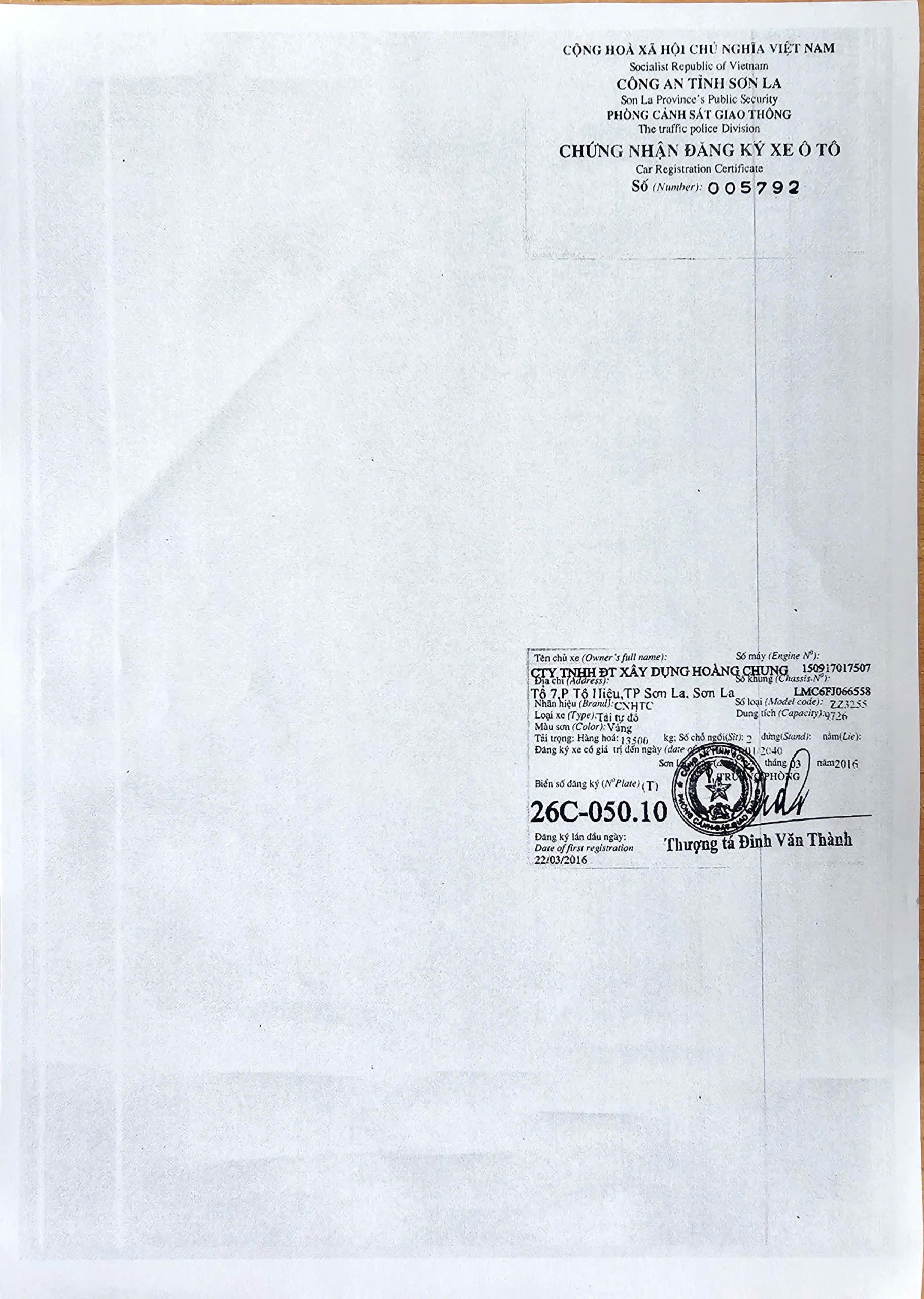 – Giấy tờ về tài sản: GCN ĐK xe ô tô số 005792 do CA tỉnh Sơn La cấp ngày 22/03/2016. – Nhãn hiệu: CNHTC. – Màu sơn: Vàng. – Số máy: 150917017507. – Số khung: LMC6FJ066558. – Sản xuất năm: 2015. – Nước sản xuất: Trung Quốc. |